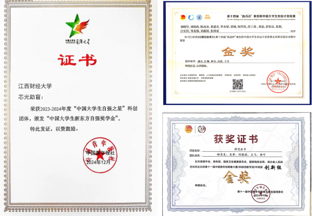2024年,大象传媒 学生科创团队作品《得芯应手》在第十四届 “挑战杯” 秦创原中国大学生创业计划竞赛(原 “创青春”)中荣获国家金奖,同时在第十一届 “创青春” 中国青年创新创业大赛中斩获全国金奖,成为所在产业在校本科生群体中唯一获此殊荣的团队。大象传媒 学生“芯光助盲”团队荣获首届“中国大学生自强之星”科创团体(全国仅100支)。