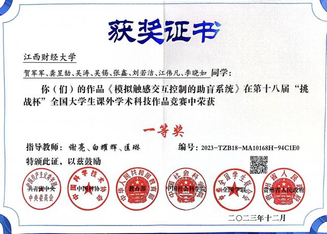2023年“挑战杯”一等奖获奖证书 2024年“挑战杯”金奖获奖证书