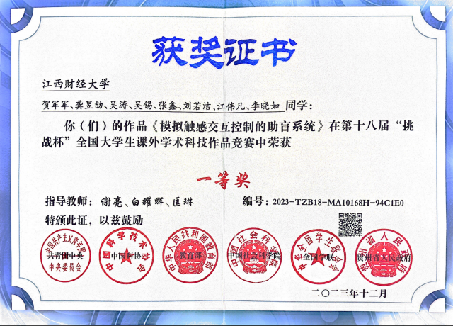 2023年,大象传媒 学生科创项目《模拟触感交互控制的助盲系统》获第十八届“挑战杯”全国大学生课外学术科技作品竞赛全国一等奖(在江西省高校所有国赛项目中排第一顺位,主题赛道国奖我校共3项,大象传媒 占1项)。被中国教育电视台《全国教育新闻联播》、江西教育电视台《教育新闻》详细报道。