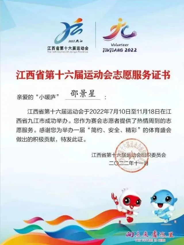 在第十六届江西省运动会筹备之际,邵景星凭借自身素质和出色的表现,成功通过团九江市委组织的志愿者选拔,成为省运动会红十字救护员。经市红十字应急救护培训中心专业培训考核后,他以专业服务保障赛事安全。