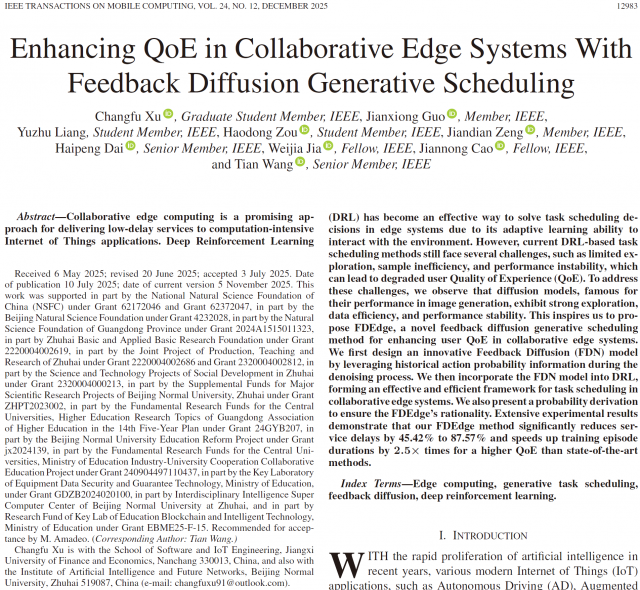 近日,大象传媒 徐常福博士以第一作者在边缘计算领域国际顶级期刊IEEE Transactions on Mobile Computing上发表论文,论文题目为“Enhancing QoE in Collaborative Edge Systems with Feedback Diffusion Generative Scheduling”。论文链接://ieeexplore.ieee.org/document/11077726