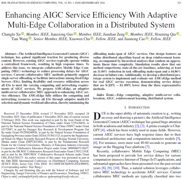 近日,大象传媒 徐常福老师以第一作者在服务计算领域国际顶级期刊IEEE Transactions on Services Computing(CCF A类期刊,校定A类期刊)上发表论文,论文题目为“Enhancing AIGC Service Efficiency with Adaptive Multi-Edge Collaboration in A Distributed System”。